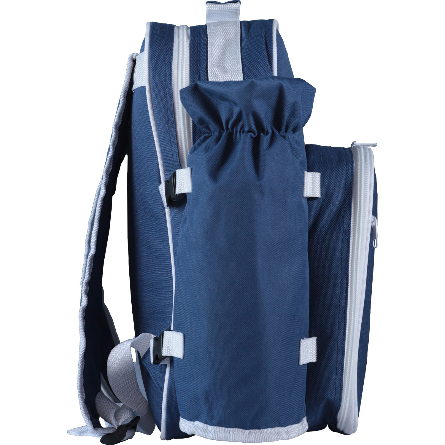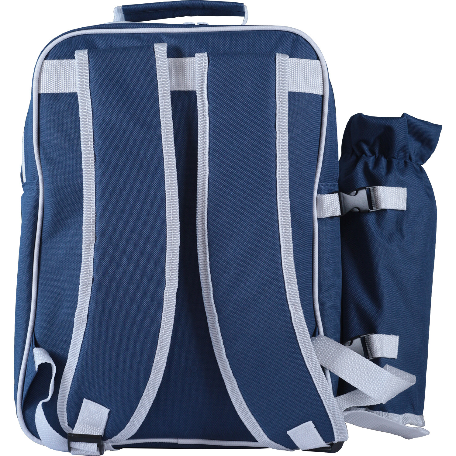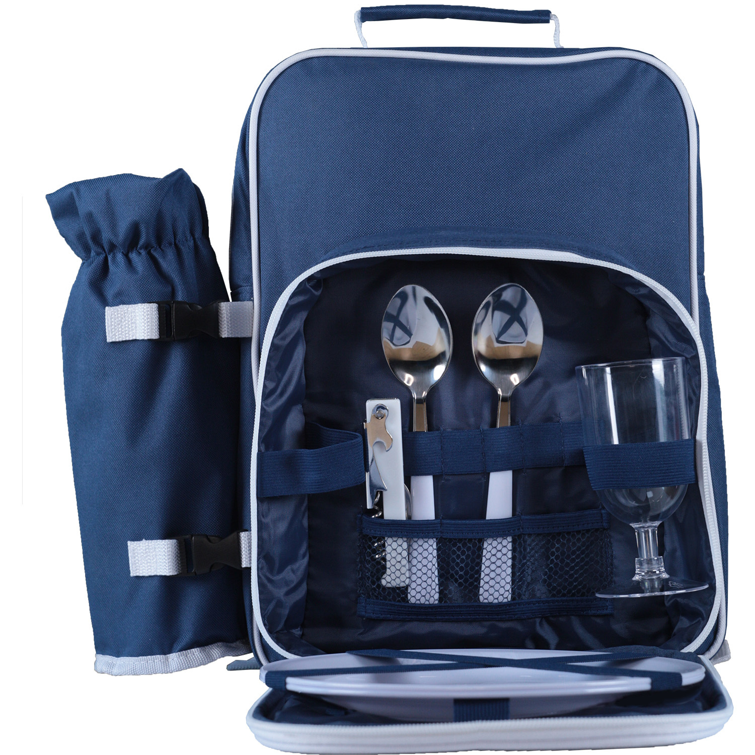 Термо-рюкзак для пикника 600D со съемным термо-чехлом для бутылки. Основное отделение имеет мягкую подкладку и термоизоляцию. Передний карман с подкладкой 210D и набивкой. Включает 6 столовых приборов из нержавеющей стали (2 вилки, 2 ножа и 2 ложки), 2 тарелки, 2 стакана PS и 1 штопор. Чехол для бутылок и основной отсек с подкладкой (PEVA) и набивкой.280 x 390 x 180 мм | Сумка бутылки: ø105 x 300 мм