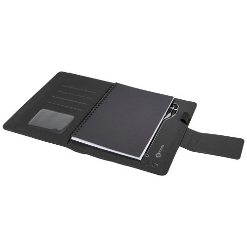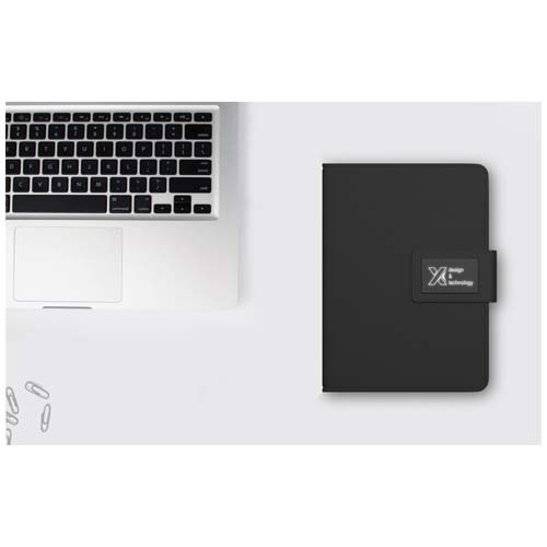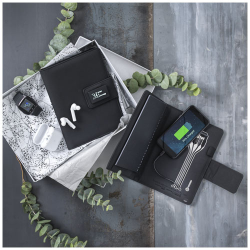 Блокнот со встроенным беспроводным зарядным устройством на 4000 мАч с подсветкой логотипа и интегрированным кабелем «3 в 1» (Type C, Android, iPhone). Входная мощность: 5 В/1 А. Выходная мощность: 5 В/2 А. При открытии загорается лого на застежке. Эта функция работает до 25 дней без подзарядки устройства! В сменном блокноте содержится 30 страниц формата A5. Поставляется в подарочной коробке из переработанной бумаги с магнитной застежкой.