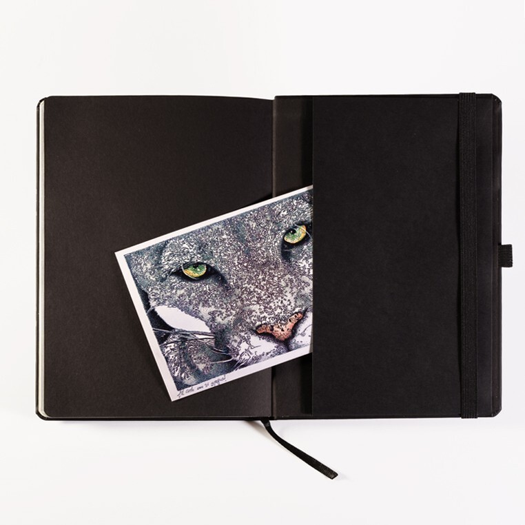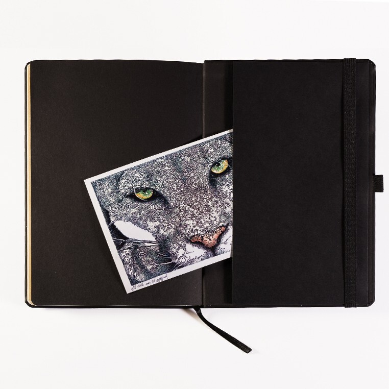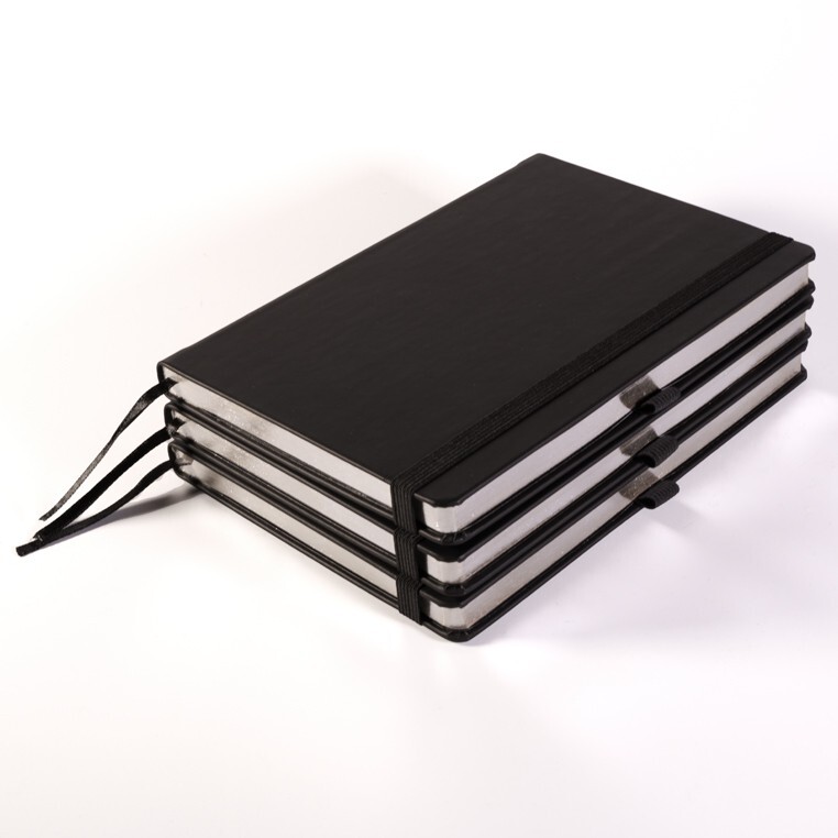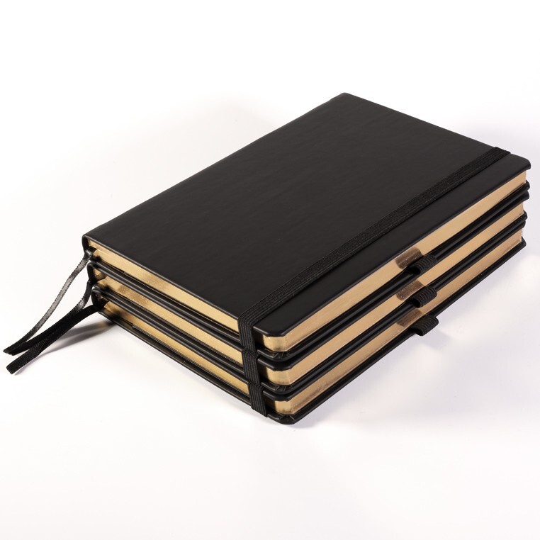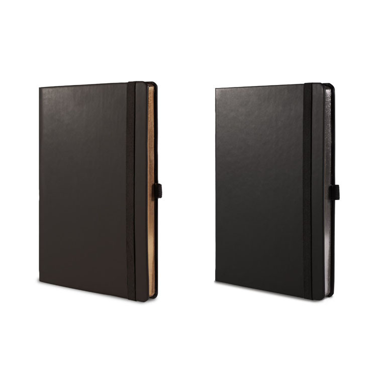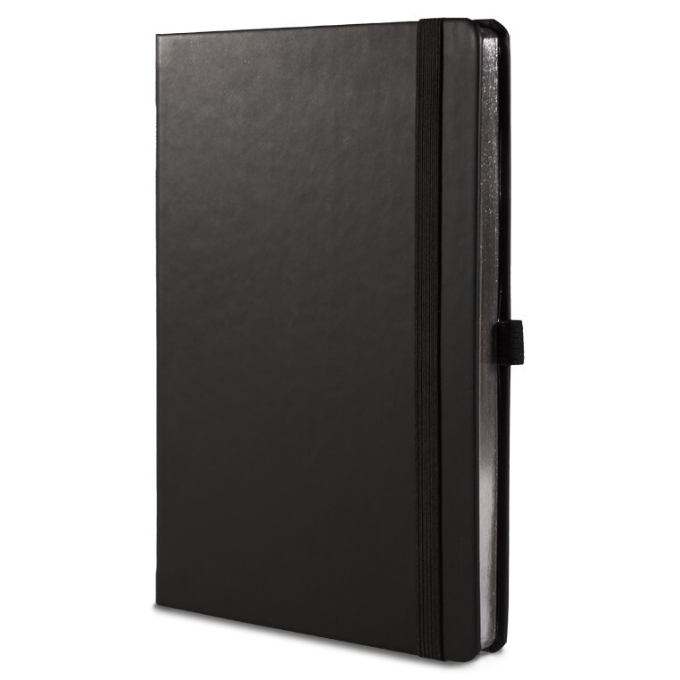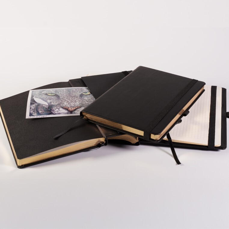 Записная книга формат 14,5х21 см в линейку 256 страниц, кремовая бумага 70 г сертифицирована FSC. Серебряный или золотой срез. Дополнительно имеются страницы в точку, в клетку, для систематизации проектов, а также листы без разметки с перфорацией. Печать в 1+1 цвет, все страницы пронумерованы. Шитый блок Форцазы из черной дизайнерской бумаги 140 гр FSC. Карман из черной дизайнерской бумаги . Обложка из премиального кожзама от ведущего итальянского производителя. Ляссе в тон обложки. Резинка 10 мм в тон обложки.
