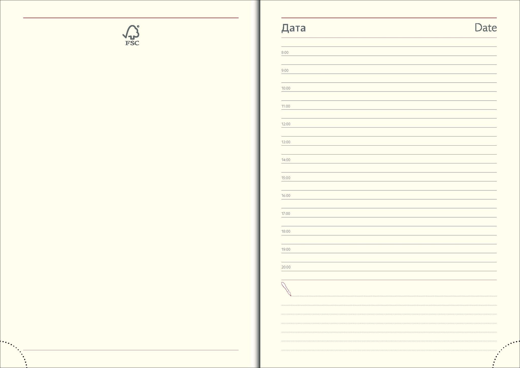 Недатированный ежедневник 145х205 мм 256 страниц, печать в 2 цвета, кремовая бумага 70 гр, блок шитый, каптал, ляссе, перфорированный уголок. Гибкая обложка из премиального голландского кожзама на бумажной основе.
