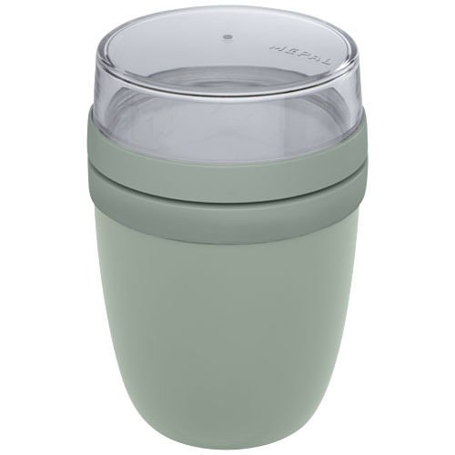 Ланч-бокс с двумя раздельными отделениями, позволяющими хранить различные продукты отдельно друг от друга. Каждое отделение закрывается отдельной крышкой, поэтому они остаются чистыми. Объем верхнего прозрачного контейнера составляет 200 мл, что соответствует примерно 75 граммами твердой пищи. Емкость нижнего контейнера составляет 500 мл. Ланч-бокс изготовлен из прочного материала, поэтому продукты в нем можно хранить в холодильнике, разогревать в микроволновой печи (сняв крышку), а сам ланч-бокс можно мыть в посудомоечной машине. Верхний прозрачный контейнер нельзя использовать в микроволновой печи. Герметичный. Без содержания БФА.