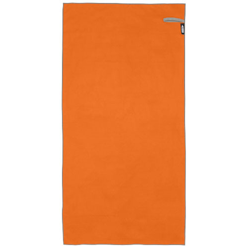 Спортивное полотенце Pieter очень хорошо впитывает влагу, легкое, быстро сохнет, а ткань прочная и очень мягкая. Когда полотенце сложено и закреплено резинкой, оно уменьшается до небольшого размера, поэтому его удобно брать с собой в тренажерный зал, бассейн, на пешую прогулку или в поход. Полотенце размером 50 х 100 см изготовлено из 90 % переработанного полиэстера GRS и 10 % нейлона. Его можно стирать в стиральной машине при температуре 40 °C. В комплект поставки входит мешок для хранения (17 x 13 см), изготовленный из переработанного ПЭТ-пластика, обеспечивающий большую площадь для печати логотипа.