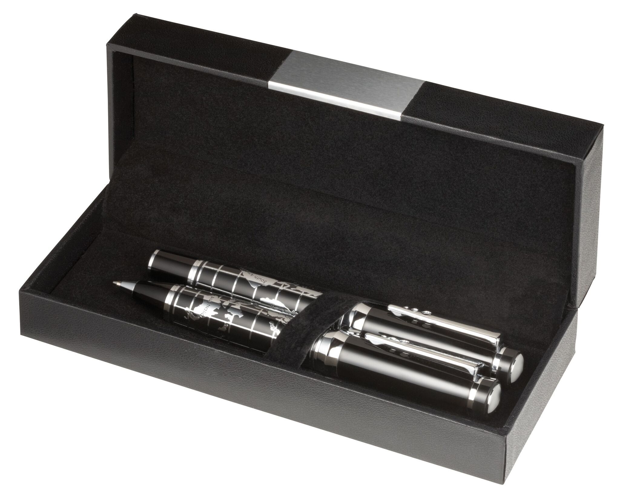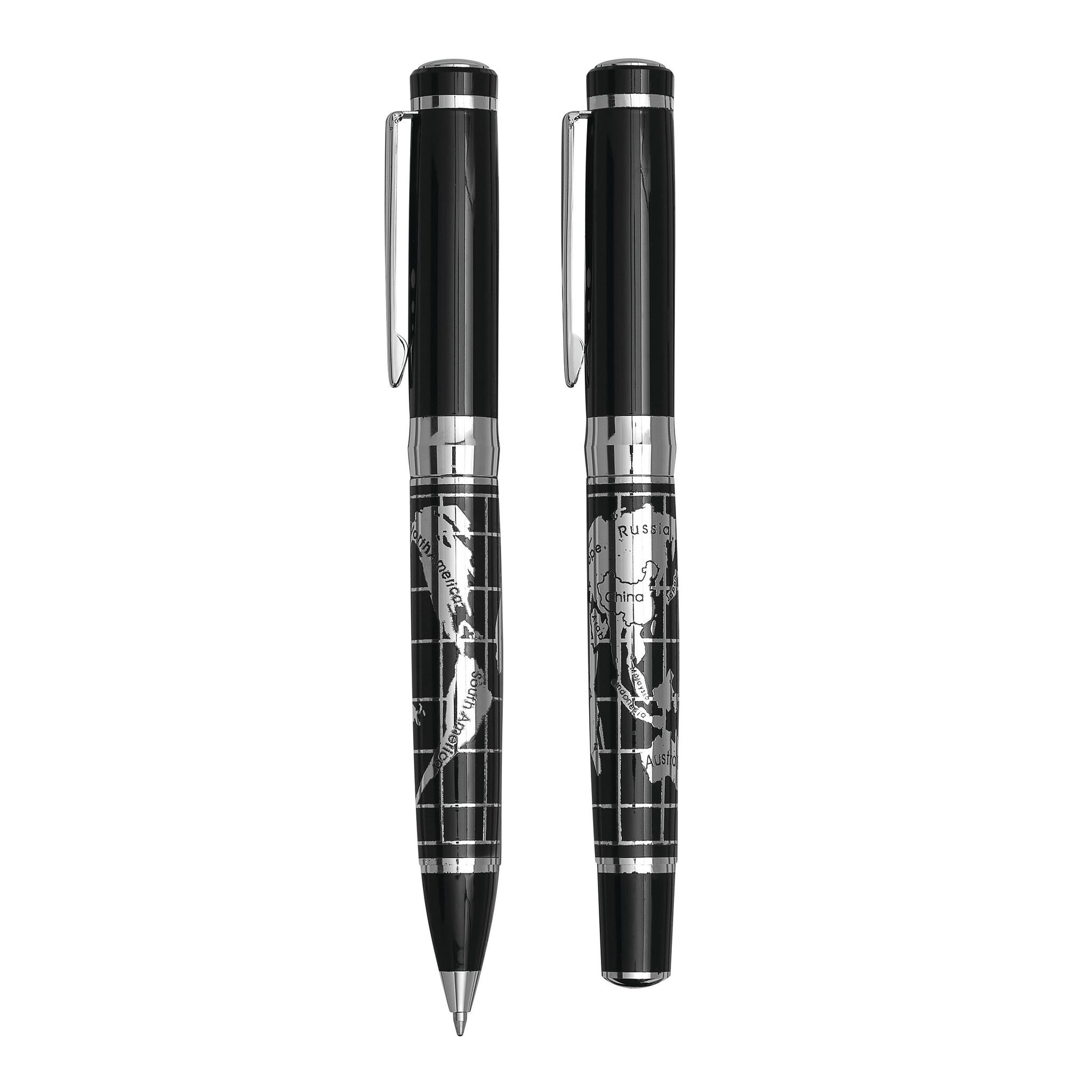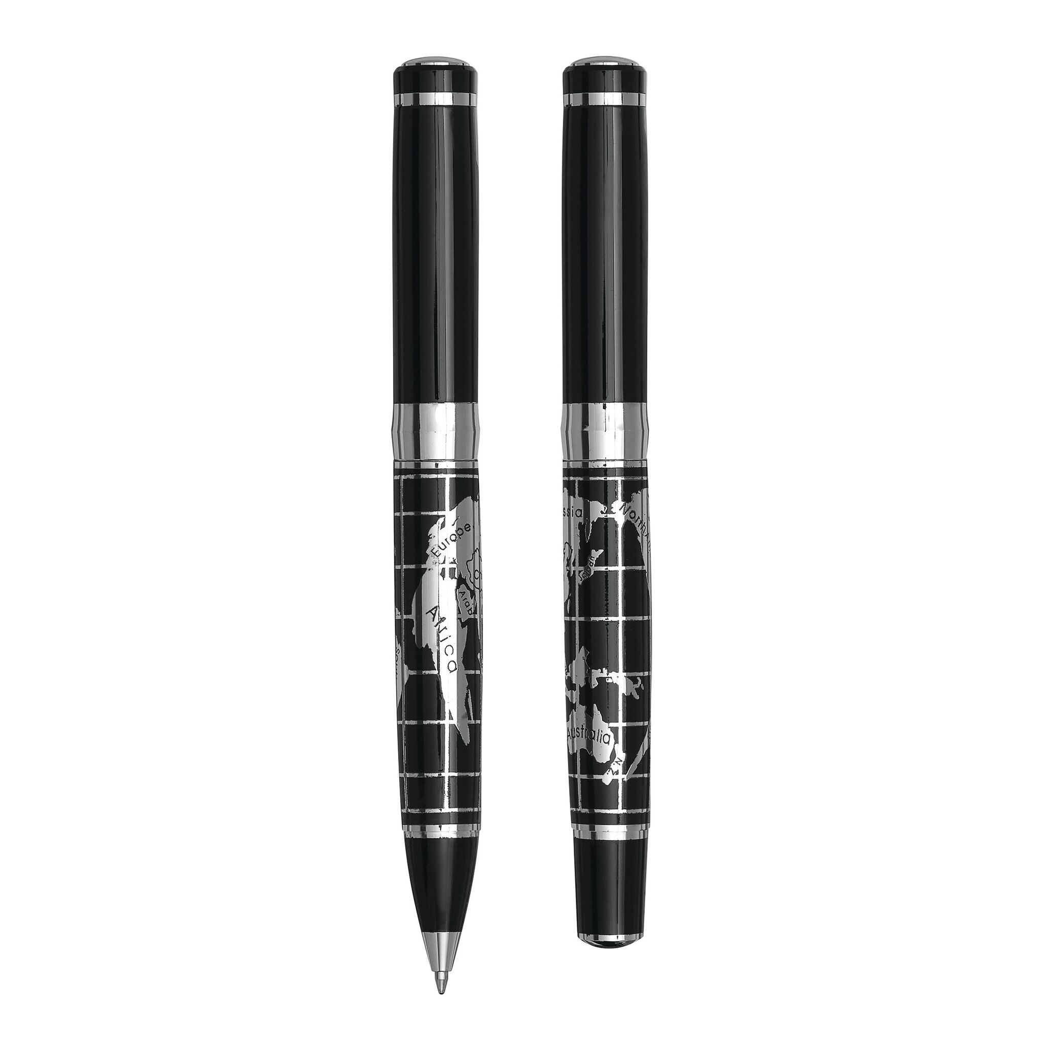 Письменный набор INTERCONTINENTAL: состоит из металлической ручки-роллера с колпачком (чёрные чернила) и металлической шариковой ручки с поворотным механизмом (синие чернила), с блестящей хромированной картой мира на корпусе; поставляется в стильной коробке с алюминиевой пластиной