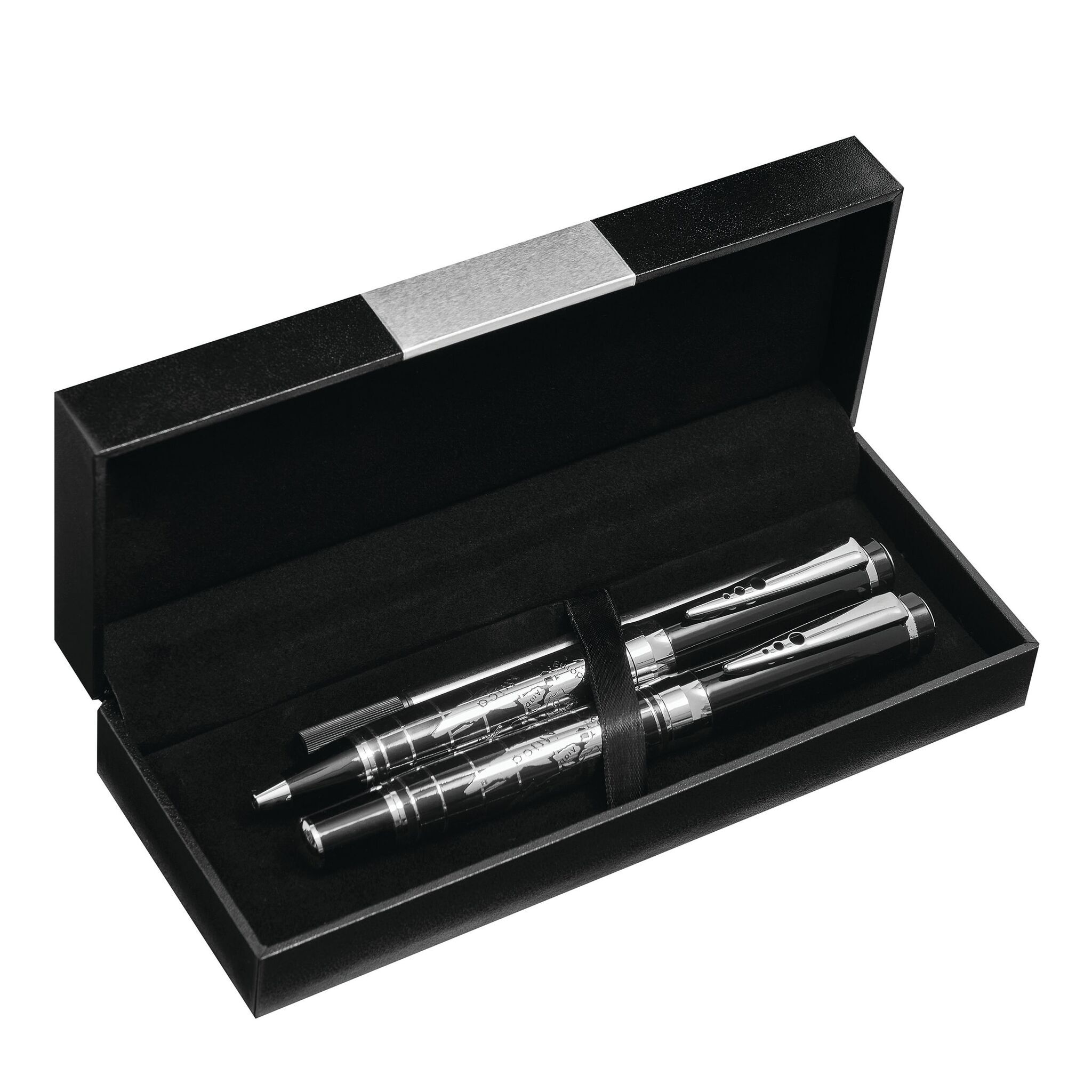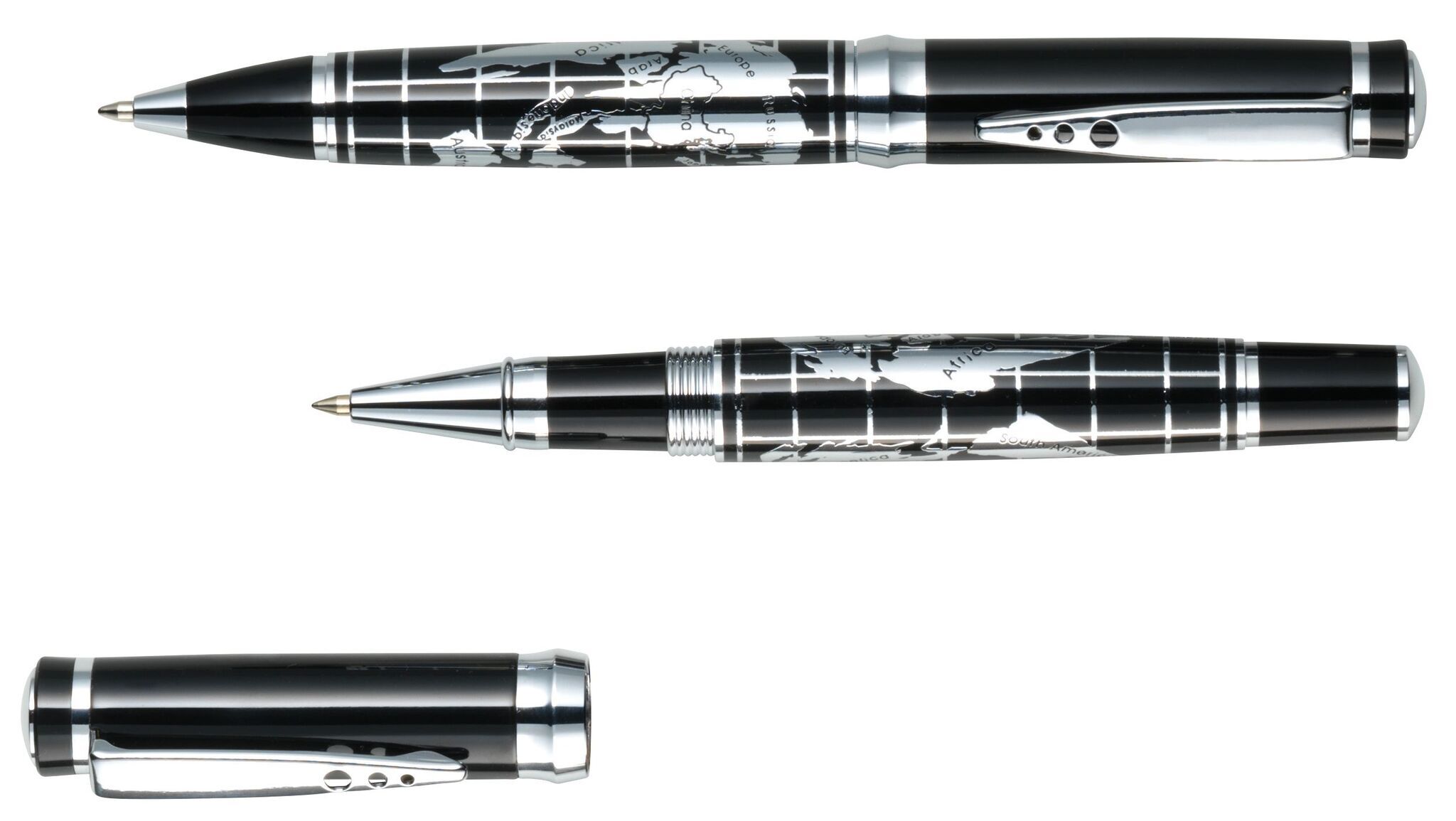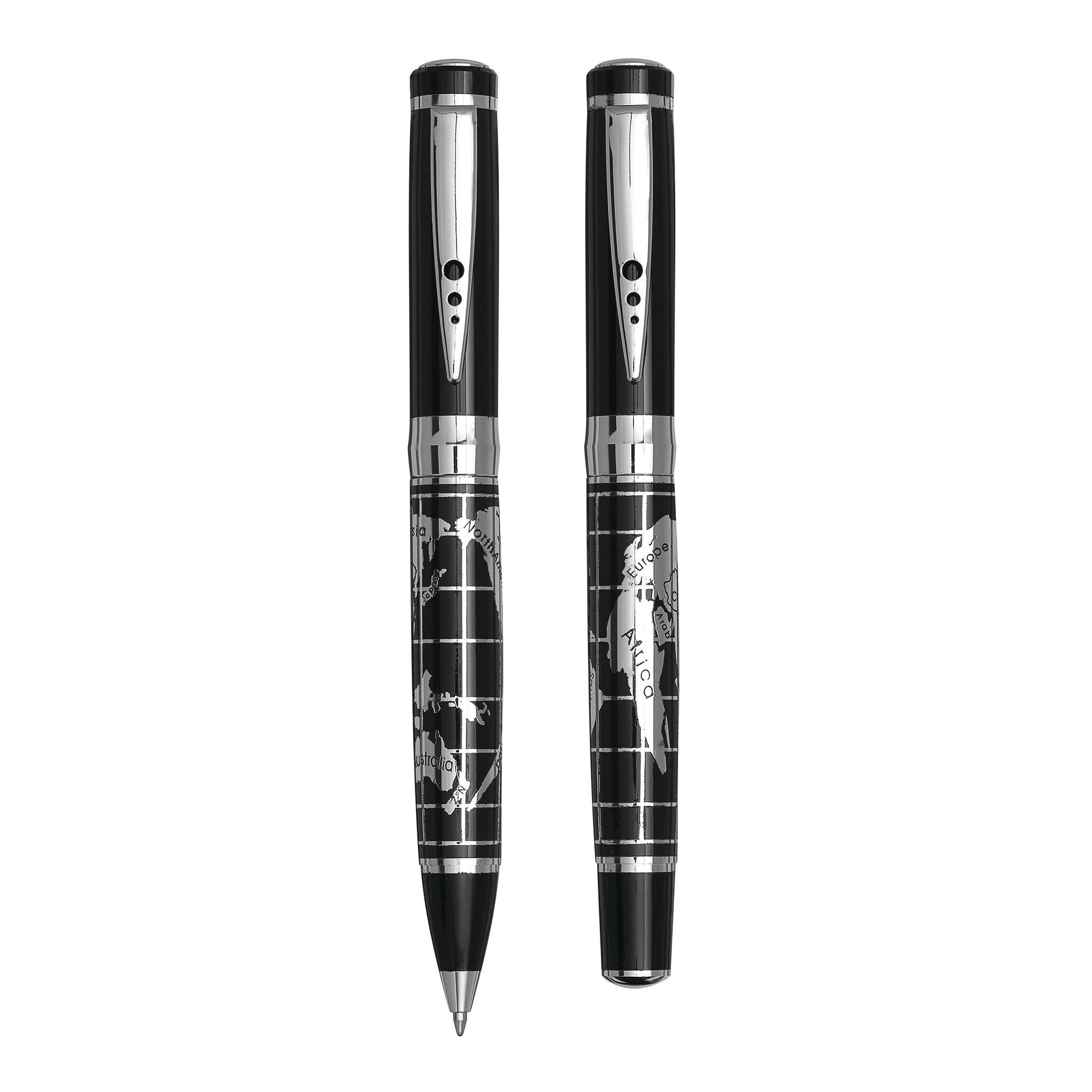 Письменный набор INTERCONTINENTAL: состоит из металлической ручки-роллера с колпачком (чёрные чернила) и металлической шариковой ручки с поворотным механизмом (синие чернила), с блестящей хромированной картой мира на корпусе; поставляется в стильной коробке с алюминиевой пластиной