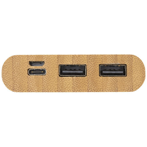 Портативное зарядное устройство емкостью 10 000 мАч из бамбука с сенсорной кнопкой включения/выключения и 4 светодиодными индикаторами для отображения оставшейся емкости батареи. Вход Micro USB 5 В/2 А, вход Type-C 5 В/3 А, выход Type-C 5 В/3.1 А макс., двойной выход USB-A 5 В/3.1 А макс., общая мощность 15.5 Вт. Поставляется с зарядным кабелем Type-C - Type-C 3 А из термополиэтилена длиной 30 см, инструкцией по эксплуатации и подарочной коробкой из крафт-бумаги. Поскольку бамбук — природный материал, цвет и размер сырья могут быть разными, что, в свою очередь, может повлиять на итоговый вид печати.