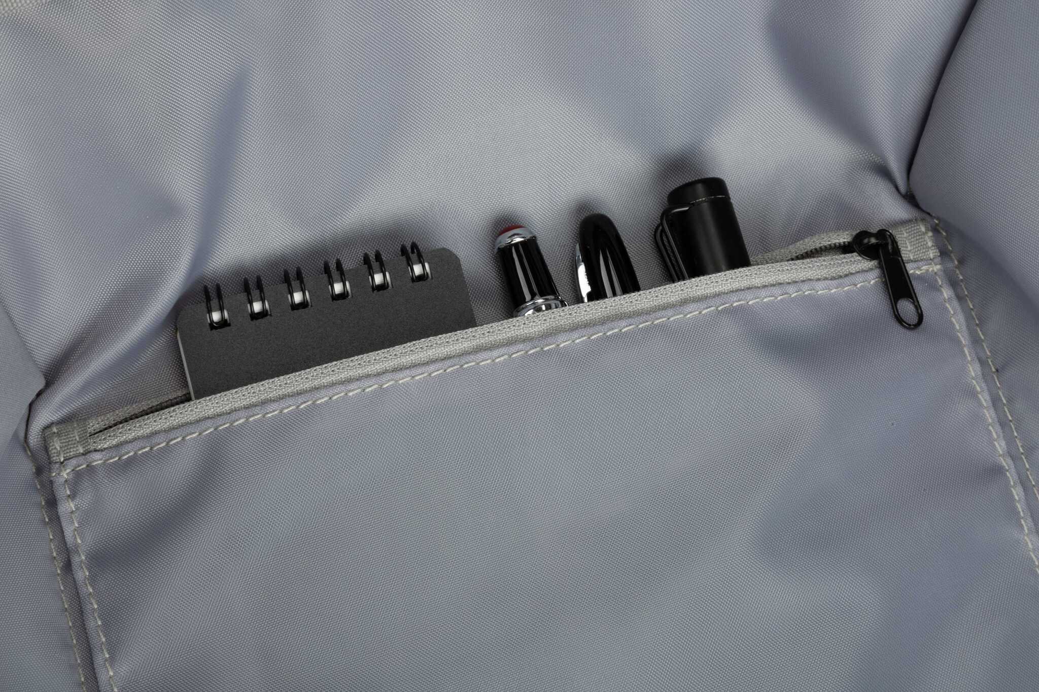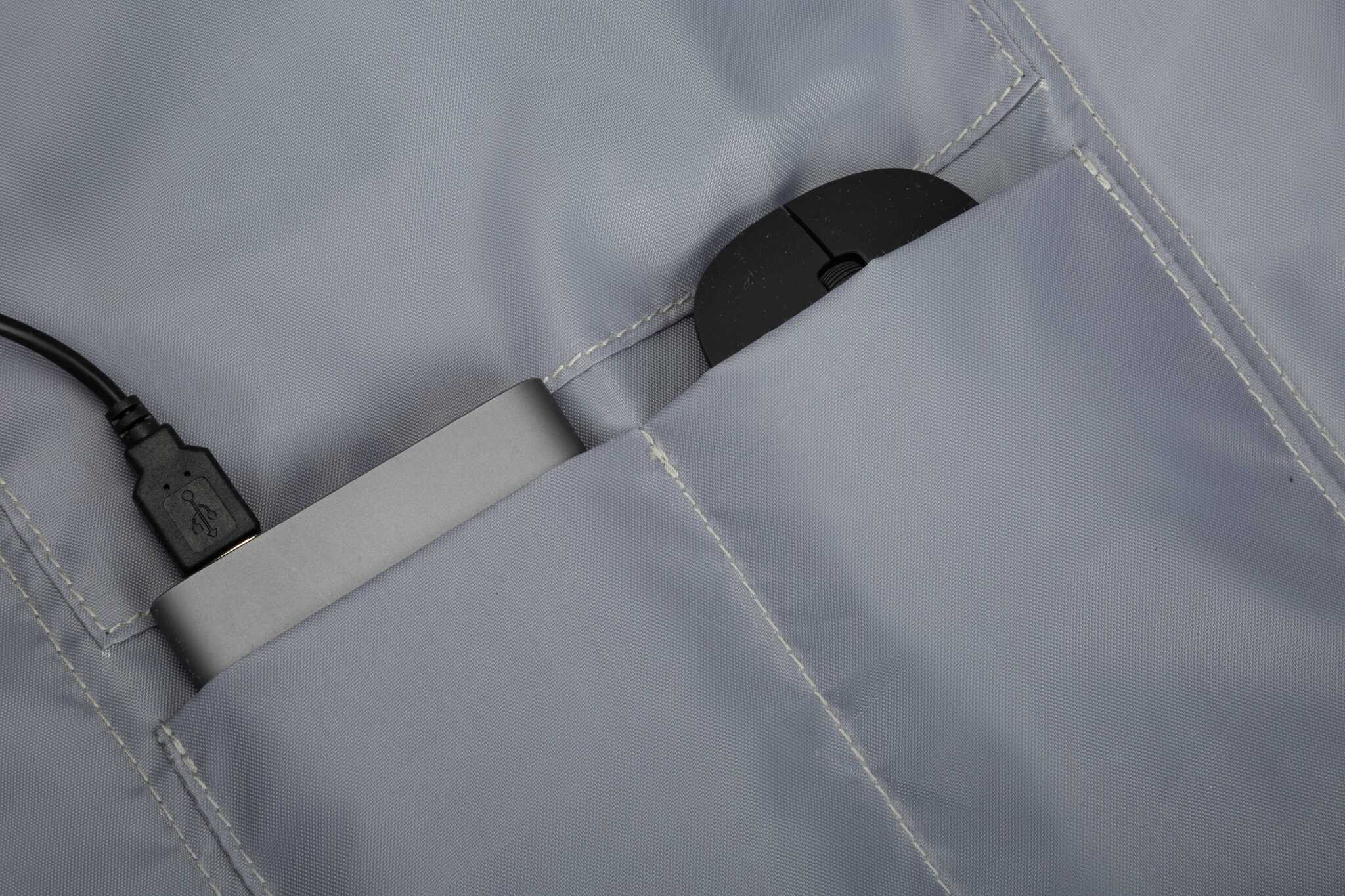 В рюкзак Kingsons KS3207W невозможно незаметно залезть. На внешней стороне нет ни карманов, ни видимых застежек. Молния, закрывающая отделение, спрятана от посторонних глаз. Открыть ее без согласия владельца не получится. Выполнен он в лаконичном дизайне и подойдет как к деловому стилю одежды, так и к повседневному. Сшит рюкзак из прочного полиэстера с жаккардовым плетением нитей, делающее ткань еще более износостойкой. Благодаря тому, что это водоотталкивающий материал, капли воды просто стекают с него, а значит содержимое просторного отделения останется сухим. Внутрь поместятся все необходимые вещи в повседневной жизни, в том числе ноутбук и планшет. В верхней части предусмотрена ручка, за которую его удобно не только носить, но и можно закреплять на выдвижной ручке чемодана. Для удобства зарядки гаджетов на ходу в месте крепления одной из лямок предусмотрен USB-порт, к которому необходимо предварительно подключить свой повербанк.