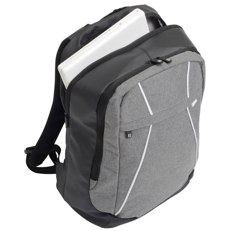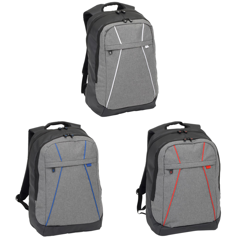 Рюкзак SPLIT: 1 наружный карман на молнии, 2 главных отдела на молнии, один главный отдел с уплотненным карманом для ноутбука и 1 вставным карманом, другой главный отдел с маленьким органайзером, переносная ручка, уплотненные наплечные лямки и спинка