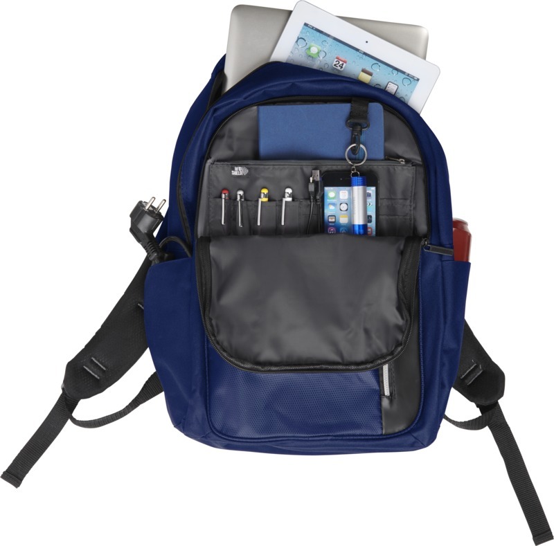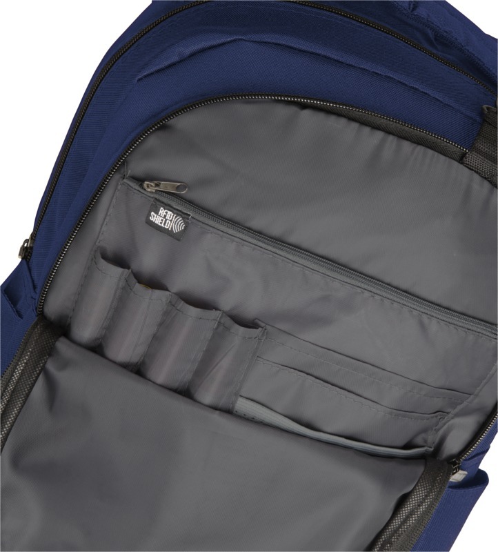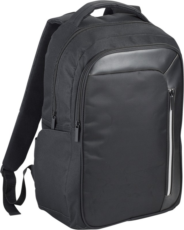 Изящный, современный рюкзак для ноутбука 15 " с большим передним карманом на молнии с карабином для ключей, и скрытым карманом с защитой RFID, чтобы защитить ваши карточки и паспорт от кражи личных данных. Большое основное отделение вмещает ноутбук 15" и специальный карман для IPad или планшета. Передняя вертикальная молния разработана, чтобы дать вам быстрый доступ к переднему карману. 2 дополнительных боковых кармана для большего места, регулируемые, мягкие ремни рюкзака позволят прикрепить к ним дополнительные аксессуары. Ручка вверху и стропа для крепления к чемодану. Реальный цвет рюкзака может незначительно отличаться в зависимости от особенностей принта, окраски и структуры ткани. 600DПолиэстер.