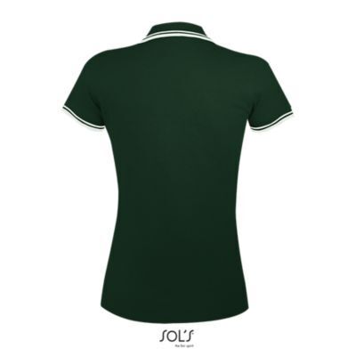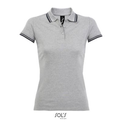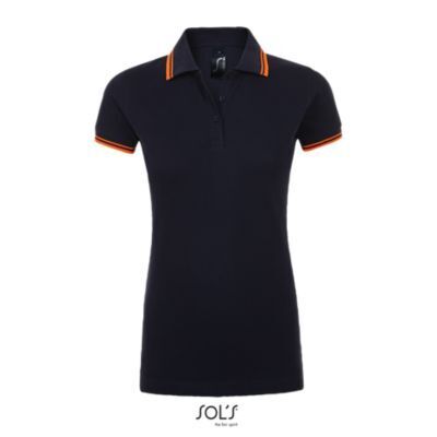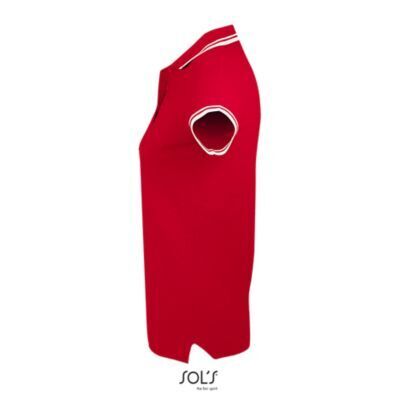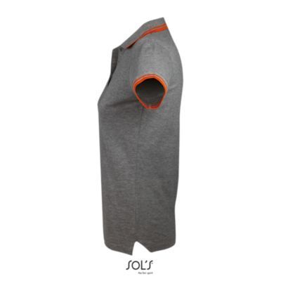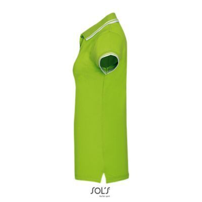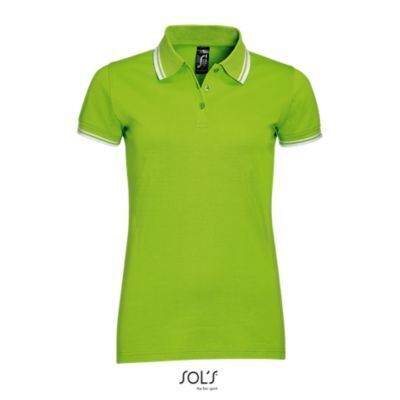 ЖЕНСКАЯ РУБАШКА ПОЛО С КОРОТКИМ РУКАВОМ. Воротник и манжеты из ребра 1x1; Усиливающая лента на шее; Короткие рукава; Контрастные полоски на воротнике и манжетах; Застежка на 3 пуговицы в тон; Приталенный крой; Крой и шитье; Боковые разрезы; Запасная пуговица на внутреннем шве