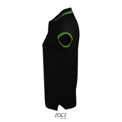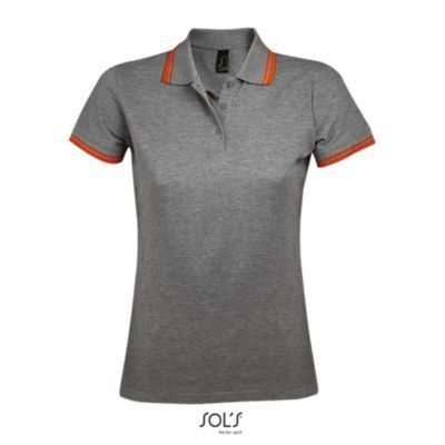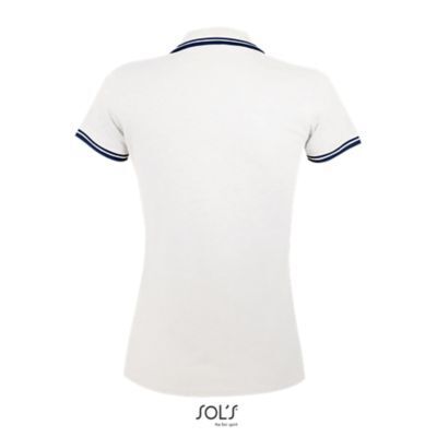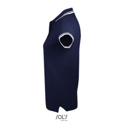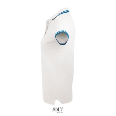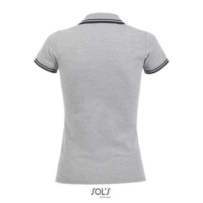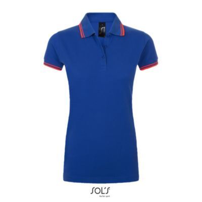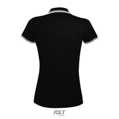 ЖЕНСКАЯ РУБАШКА ПОЛО С КОРОТКИМ РУКАВОМ. Воротник и манжеты из ребра 1x1; Усиливающая лента на шее; Короткие рукава; Контрастные полоски на воротнике и манжетах; Застежка на 3 пуговицы в тон; Приталенный крой; Крой и шитье; Боковые разрезы; Запасная пуговица на внутреннем шве