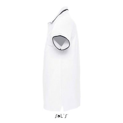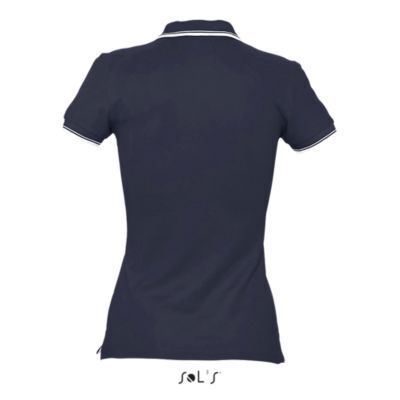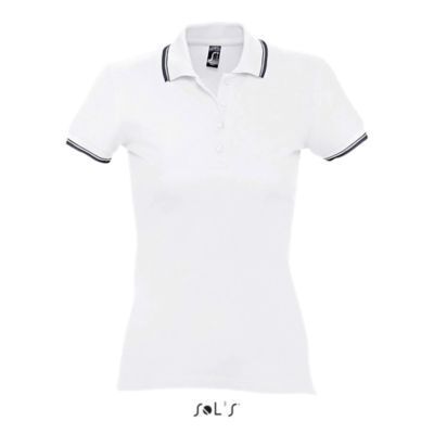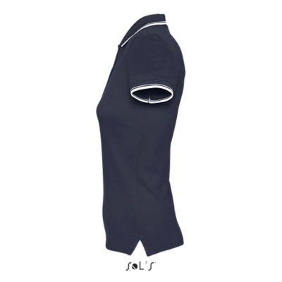 ЖЕНСКАЯ РУБАШКА ПОЛО С КОРОТКИМ РУКАВОМ. Ребристый воротник и манжеты; Подкладка на воротнике; Короткие рукава; Контрастный полосатый воротник и манжеты; Однотонный воротник с 4 пуговицами; Прямой подол с контрастными боковыми разрезами из саржи; Вшитый разрез; Запасная пуговица на внутреннем боковом шве