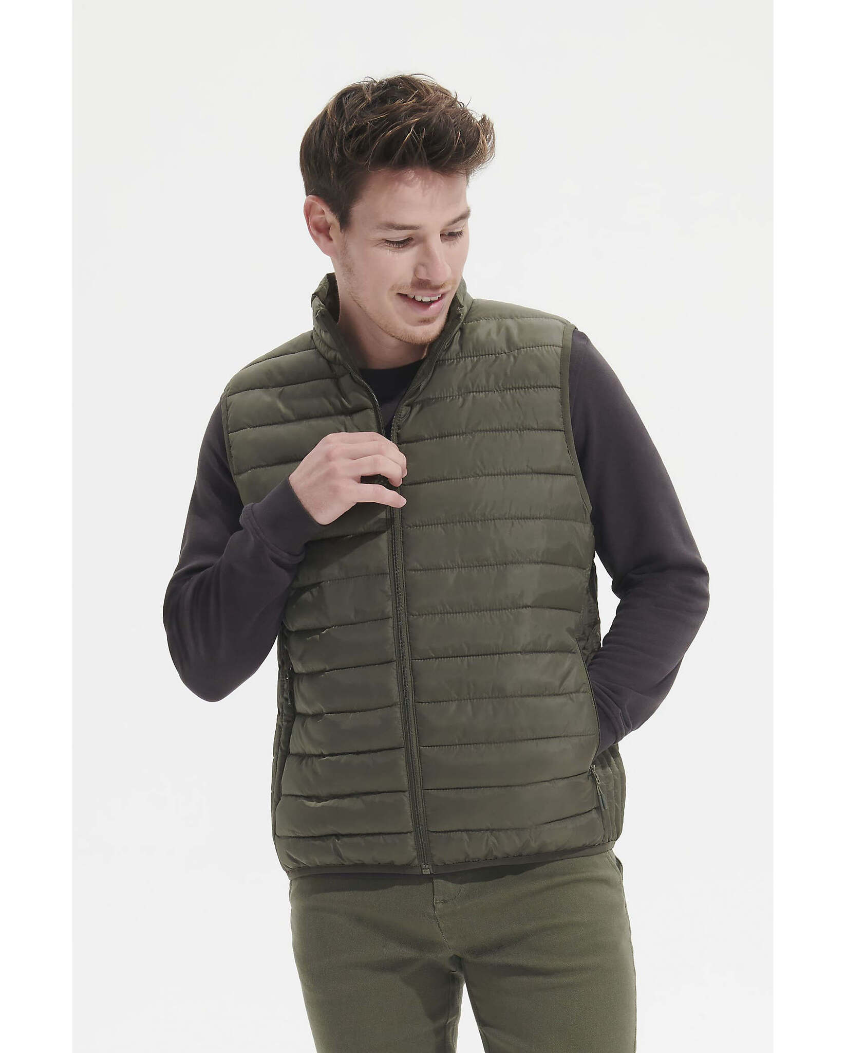 Основная застежка и боковые карманы на нейлоновой молнии в тон. Металлический бегунок в тон с оригинальным черным брелоком. Стоячий воротник. Низ и проймы с эластичной тесьмой в тон. Сумка для хранения.