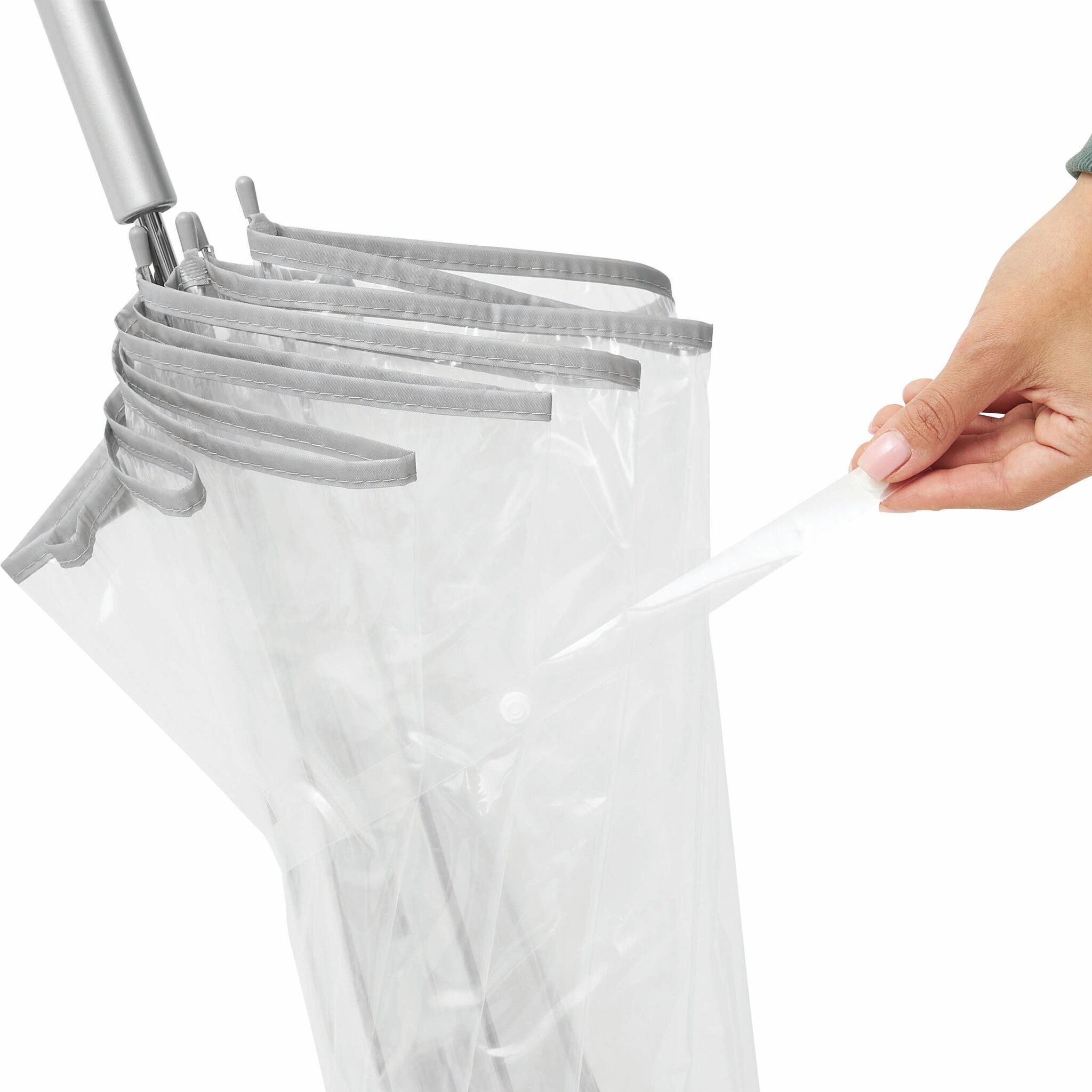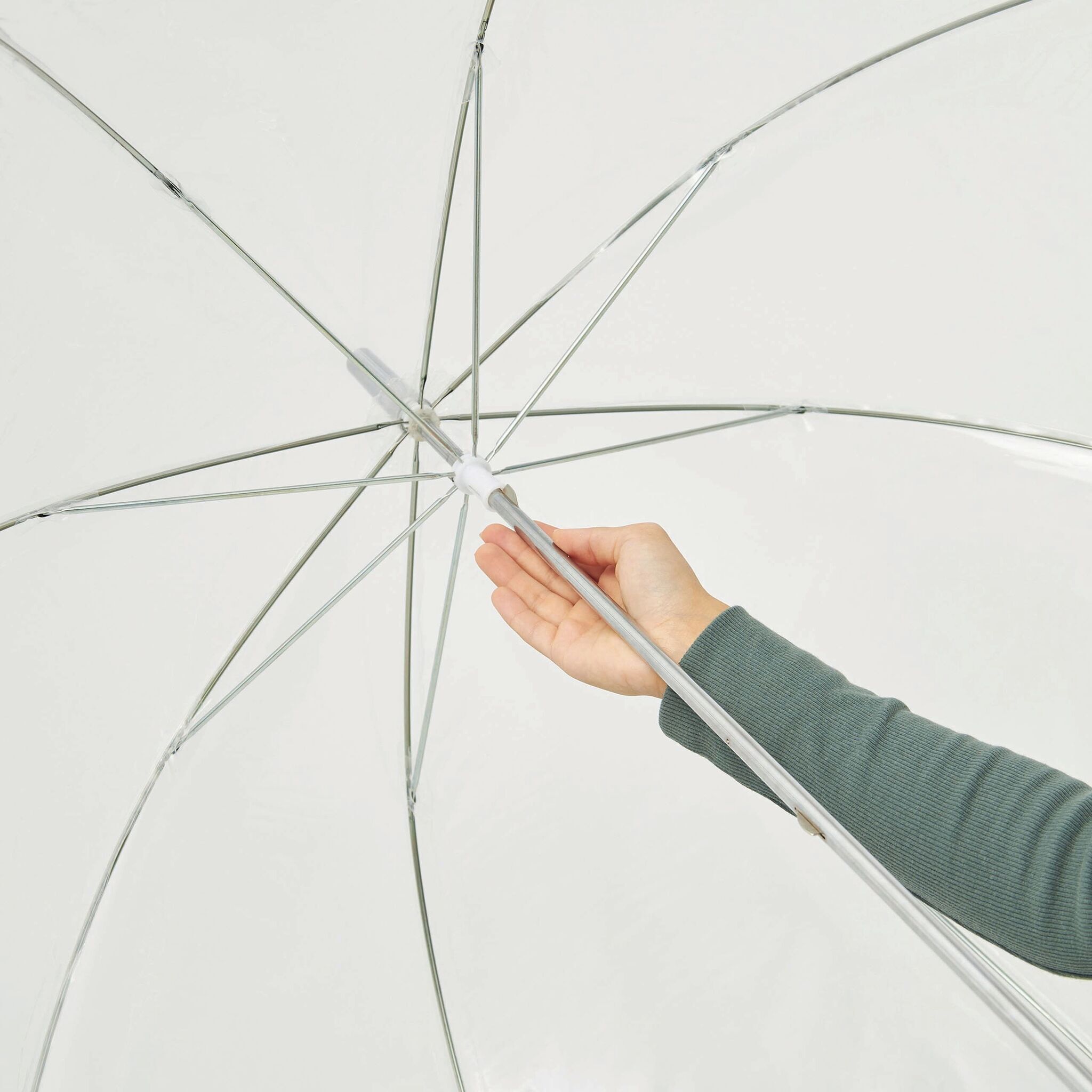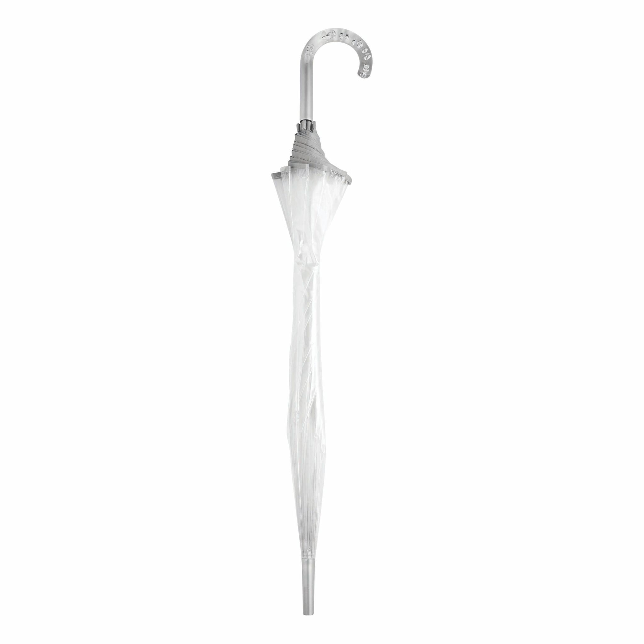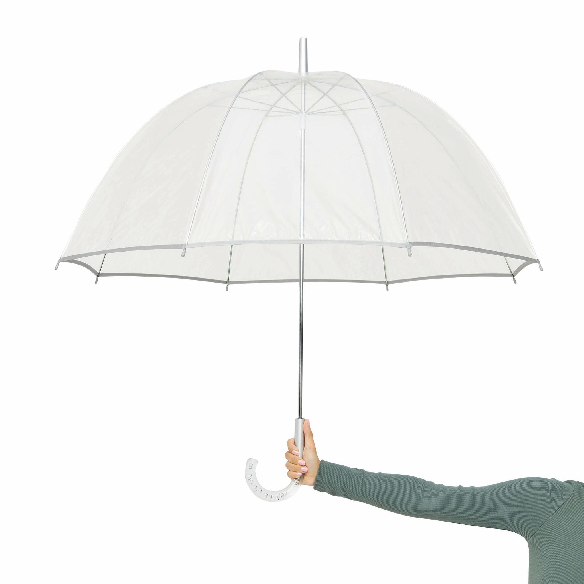 Зонт BELLEVUE с куполом в форме колокола, прозрачнайа пластиковая ручка с пузырьками воздуха, прозрачный купол клеёнка РОЕ, трость и спицы металлические, серебряная окантовка и застёжка.