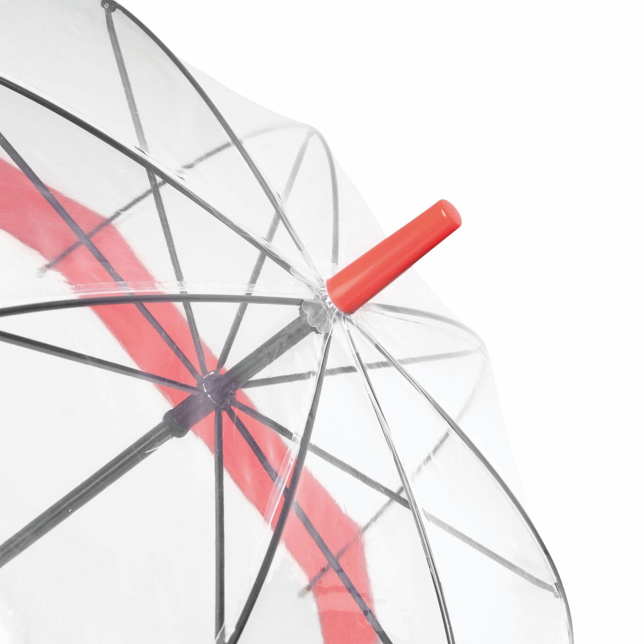 Зонт в форме купола HONEYMOON: металлический стержень и спицы, пластиковые наконечники и верхушка, пластиковая рукоятка-крюк, прозрачный купол POE с цветной окантовкой, стягивающая лента с кнопочной застёжкой