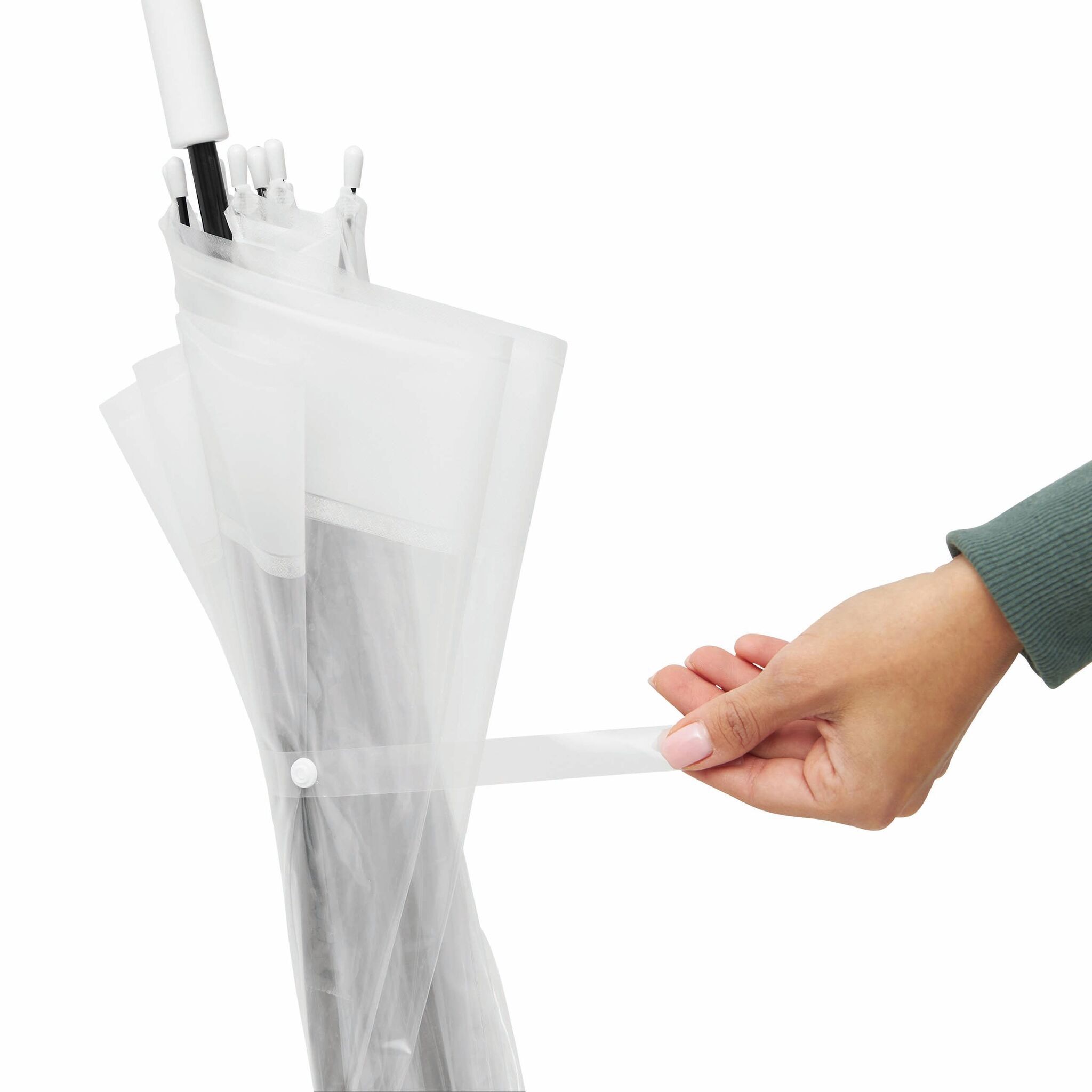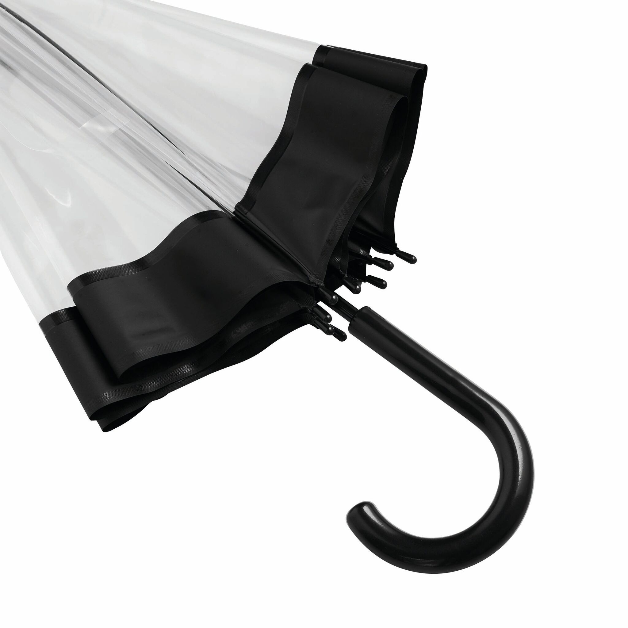Зонт в форме купола HONEYMOON: металлический стержень и спицы, пластиковые наконечники и верхушка, пластиковая рукоятка-крюк, прозрачный купол POE с цветной окантовкой, стягивающая лента с кнопочной застёжкой
